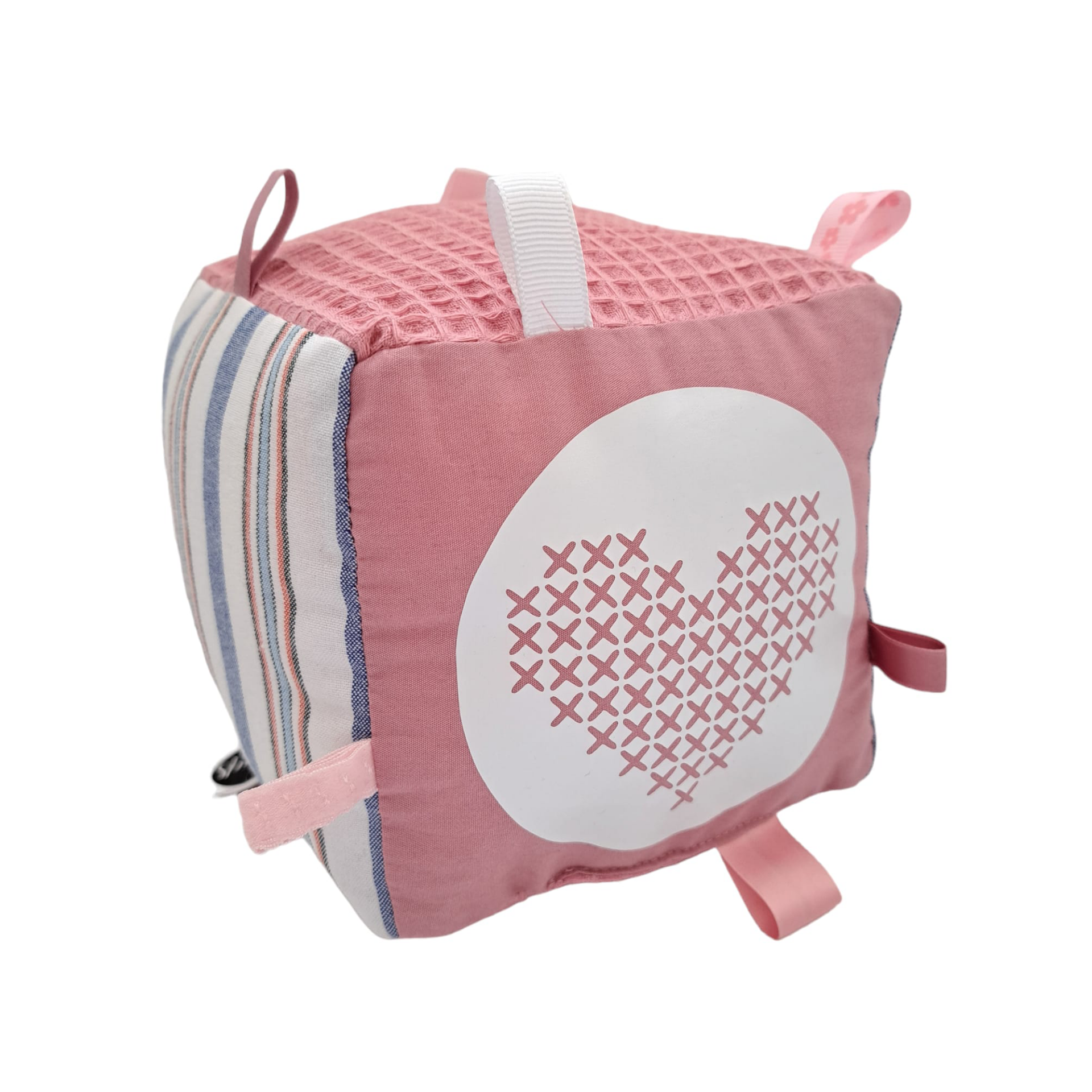 Zachte speelkubus met daarop twee afbeeldingen. De kubus is gemaakt van boezelstof (stof van het Urker meisjes- en vrouwenpak), wit katoen en een roze wafelstof. In de kubus zit een belletje een aan de kubus zitten leuke labeltjes om aan te friemelen!