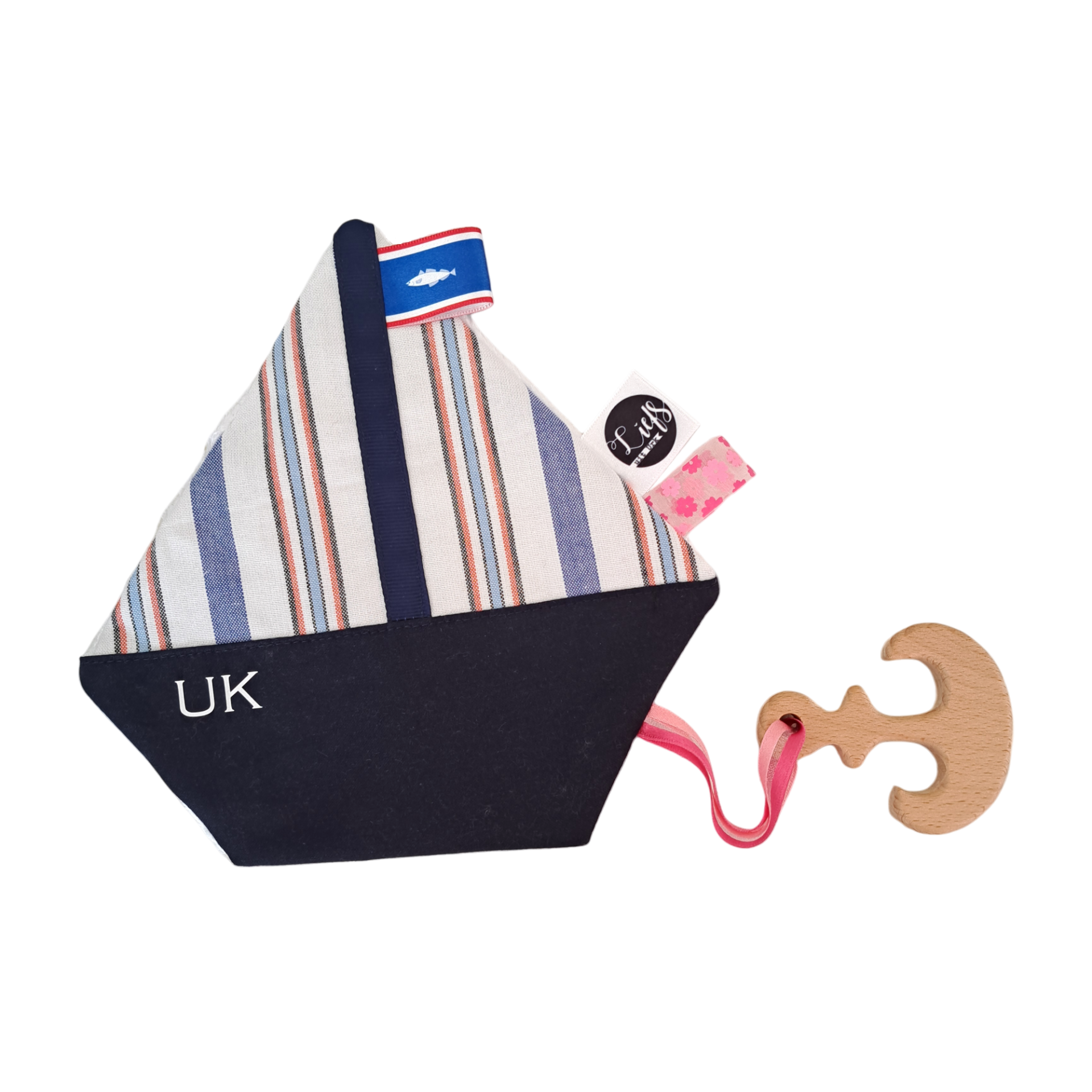 Handgemaakt, knisperend speelbootje met daaraan een houten bijtring in de vorm van een anker. In de mast van het bootje hangt een heuse Urker vlag! De voorkant van het bootje is gemaakt van boezelstof (stof van het Urker meisjes- en vrouwenpak) en blauw katoen. De achterkant is gemaakt van fijne, zachte Minky-stof met balletjes.
