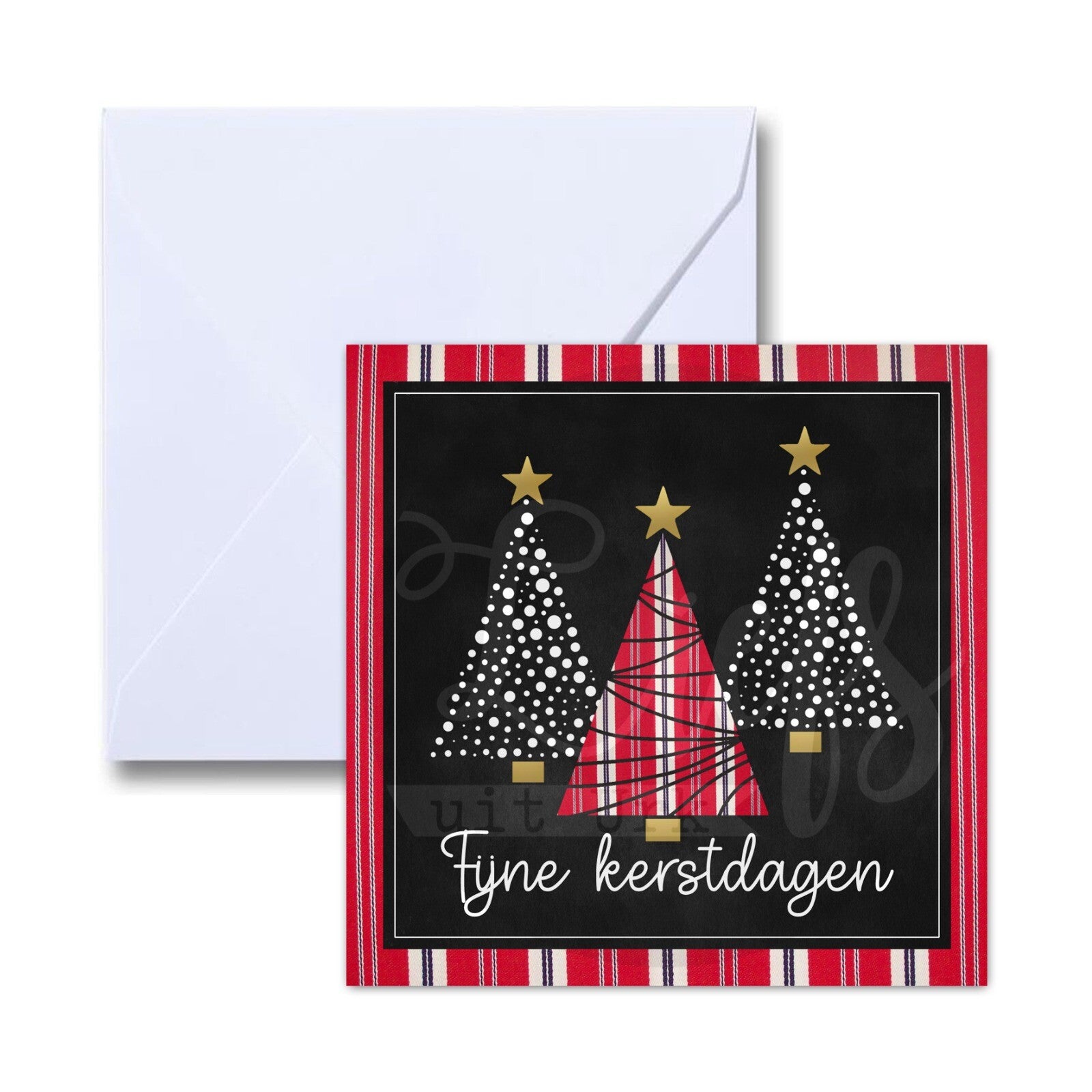 Dubbele wenskaart (formaat 13 x 13 cm) bedrukt met randje striept, kerstbomen en de tekst 'Fijne kerstdagen'. De wenskaart wordt geleverd met envelop.
