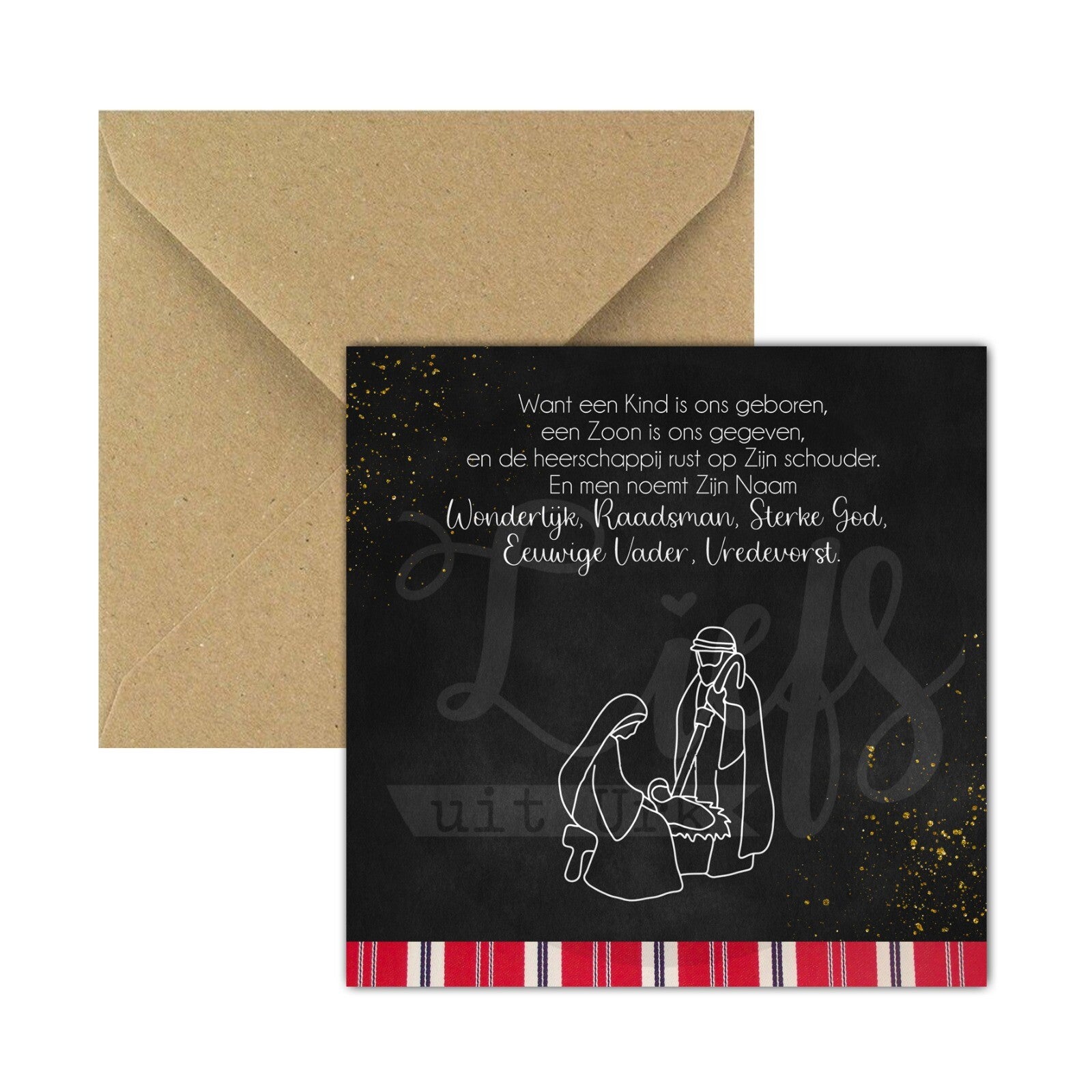 Dubbele wenskaart (formaat 13 x 13 cm) bedrukt met randje striept, lijntekening van Jozef & Maria en de tekst 'Want een Kind is ons geboren, een Zoon is ons gegeven, de heerschappij rust op Zijn schouder. En men noemt Zijn Naam Wonderlijk, Raadsman, Sterke God, Eeuwige Vader, Vredevorst'. De wenskaart wordt geleverd met envelop.