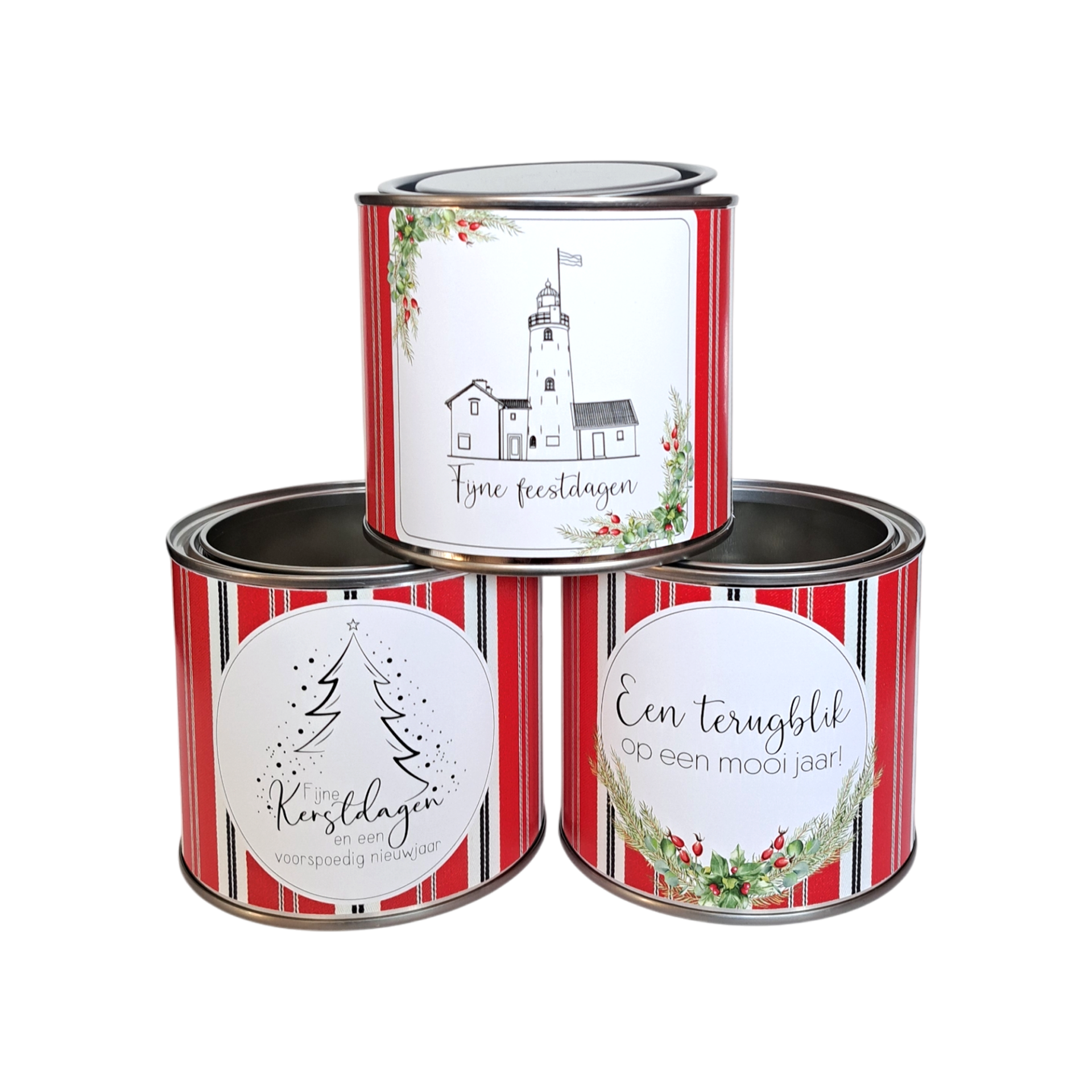 Leuk blik met strieptprint. Keuze uit verschillende ontwerpen in kerst-thema. Het blik is zelf te vullen met lekkers.