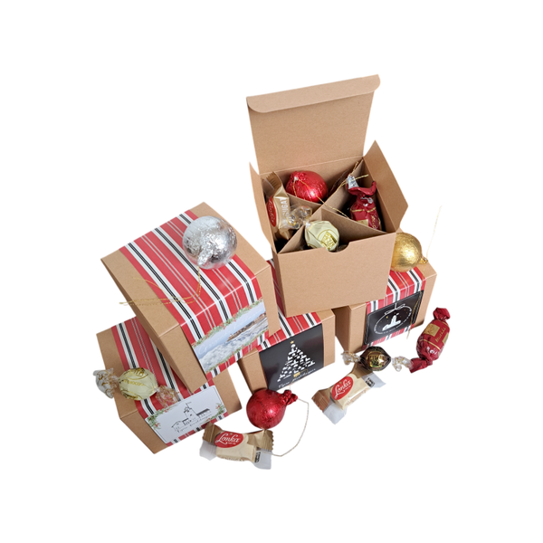 Leuk cadeaudoosje met wikkel met strieptprint en Urker afbeelding(en). Keuze uit vier ontwerpen. Het doosje is gevuld met lekkere chocolade en nougat.