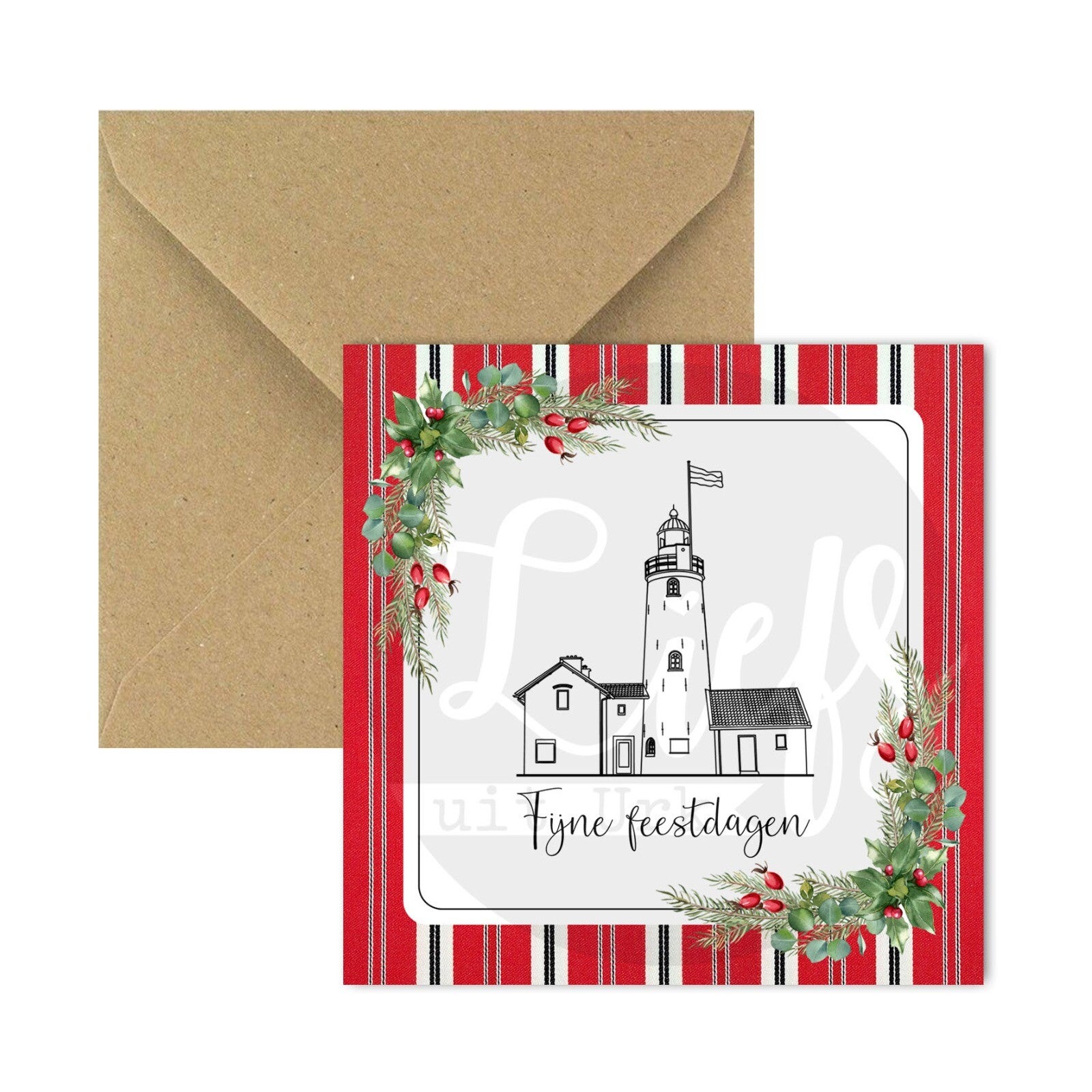 Dubbele wenskaart (formaat 13 x 13 cm) bedrukt met striept, unieke tekening van de Urker vuurtoren, kersttakjes en de tekst 'Fijne feestdagen'. De wenskaart wordt geleverd met envelop.