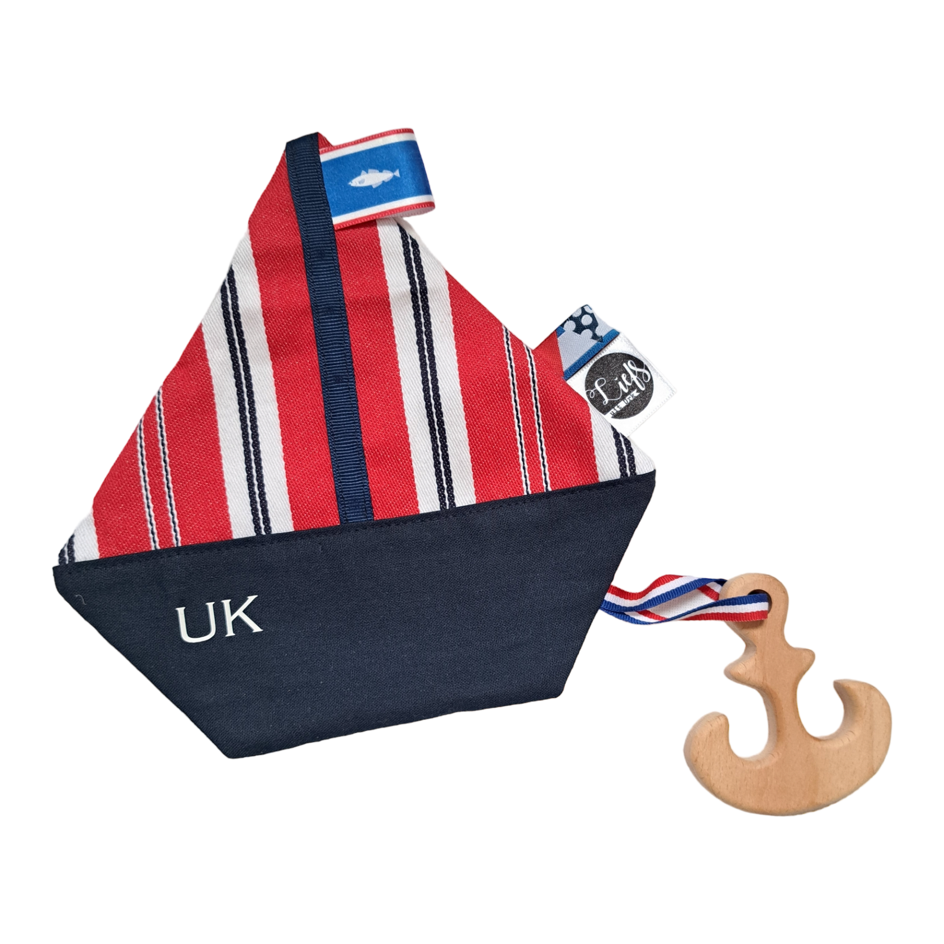Handgemaakt, knisperend speelbootje met daaraan een houten bijtring in de vorm van een anker. In de mast van het bootje hangt een heuse Urker vlag! De voorkant van het bootje is gemaakt van striept/boezelstof en blauw katoen. De achterkant is gemaakt van fijne, zachte Minky-stof met balletjes. Op de romp van het bootje is het bedrijfslogo gedrukt.