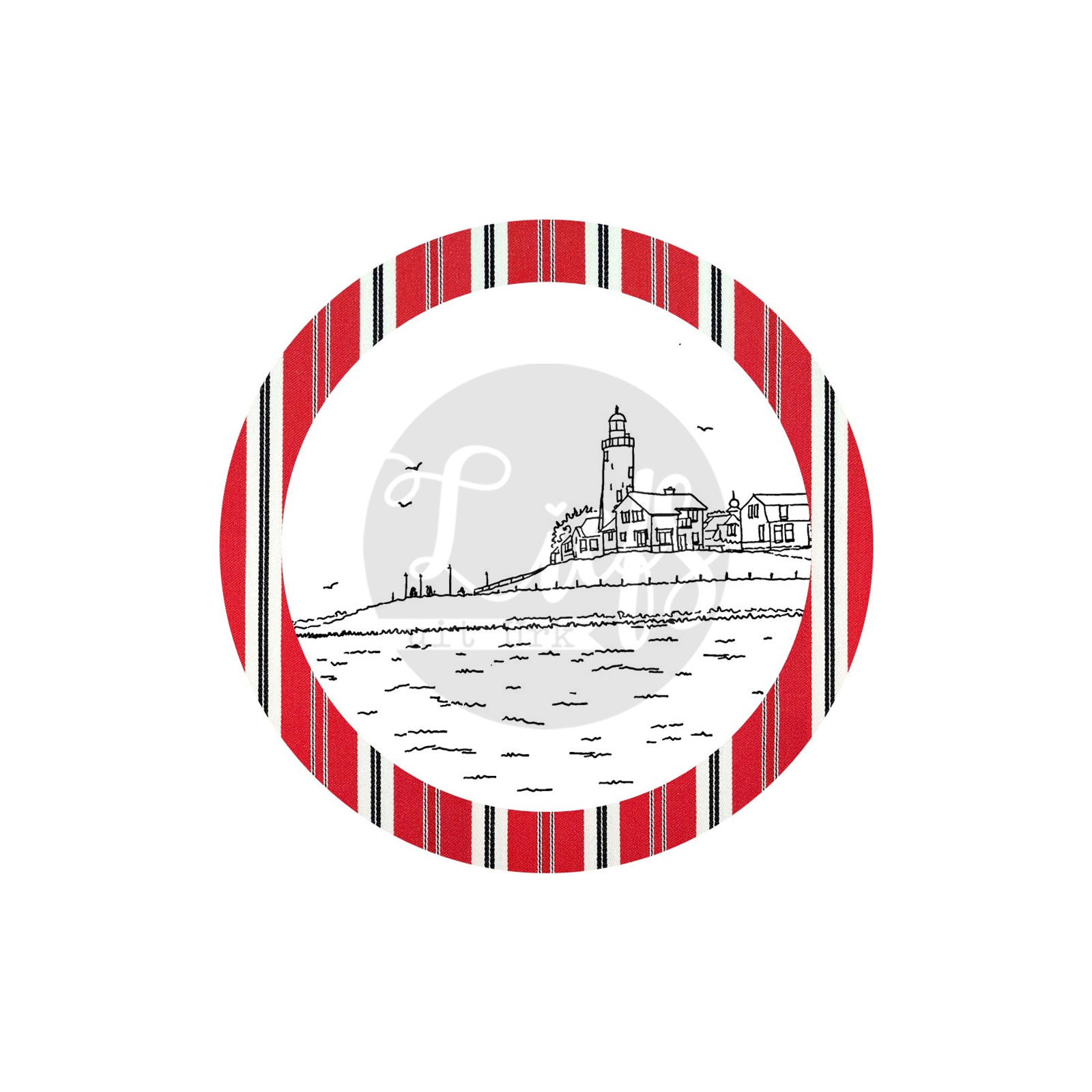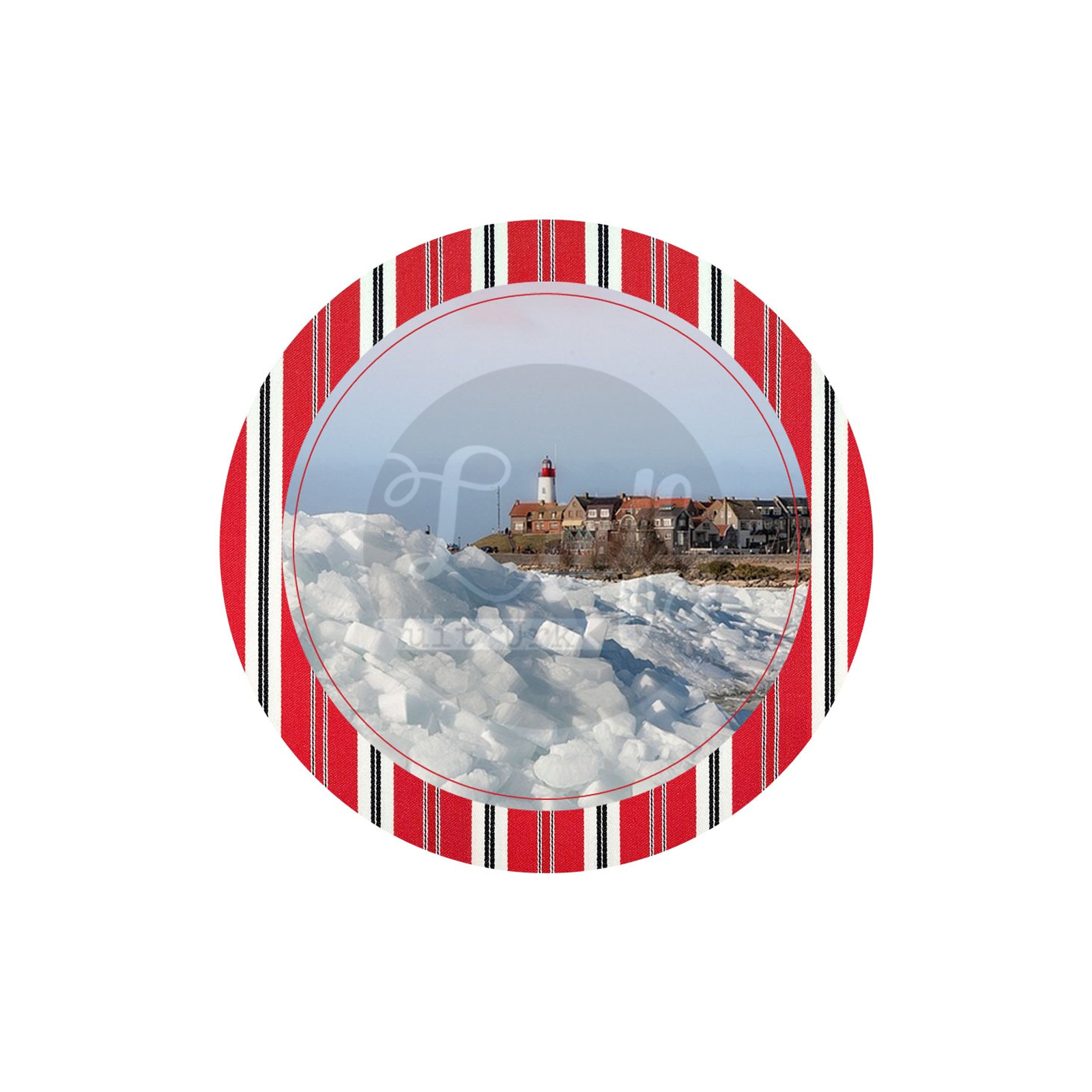 Ronde kerst(boom)hanger met randje striept en foto van Urk in de winter of unieke tekening van de Urker vuurtoren of skyline. Aan de hanger zit een goudkleurig koordje. De hanger heeft een mooie, glanzende toplaag.