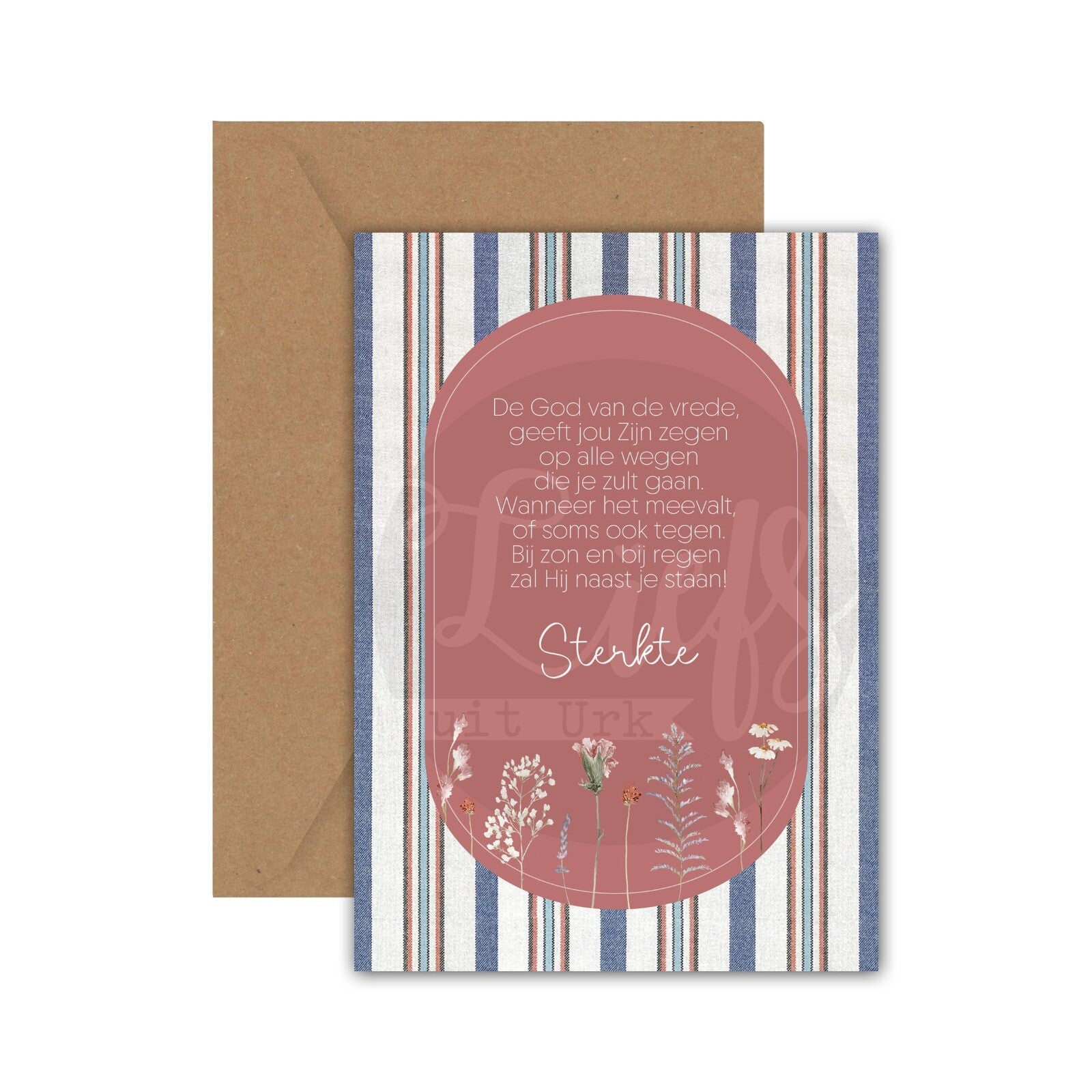 Enkele wenskaart (formaat 10,5 x 14,8 cm) bedrukt met boezelstof, veldbloemen en een bemoedigend lied . De wenskaart wordt geleverd met envelop.