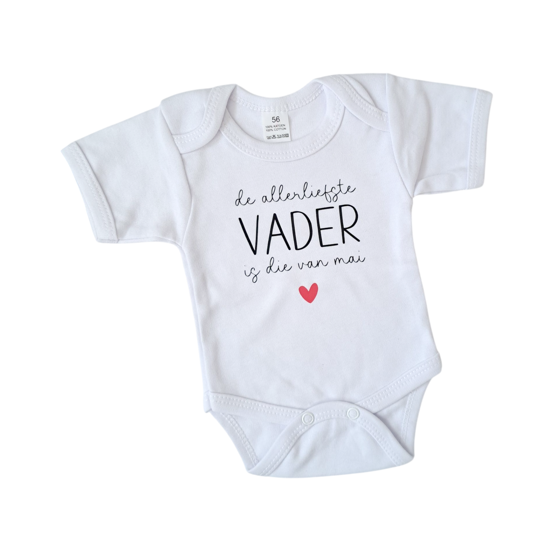 Wit rompertje met daarop de tekst ‘De allerliefste vader is die van mai' met een rood hartje. Het rompertje is te bestellen in verschillende maten.