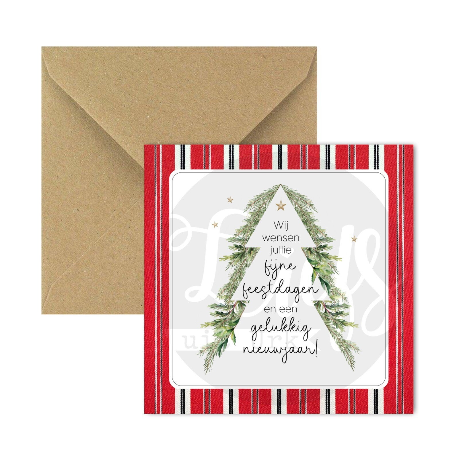Dubbele, vierkante wenskaart (formaat gevouwen 13 x 13 cm) bedrukt met striept, dennenboom en de tekst 'Wij wensen jullie fijne feestdagen en een gelukkig nieuwjaar!'. De wenskaart wordt geleverd met envelop.