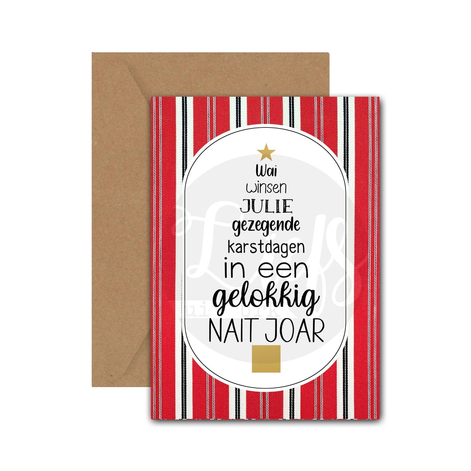 Dubbele, rechthoekige wenskaart (formaat gevouwen 10.5 x 14.8 cm) bedrukt met striept en de tekst 'Wai winsen julie gezegende karstdagen in un gelokkig nait joar' in de vorm van een kerstboom. De wenskaart wordt geleverd met envelop.